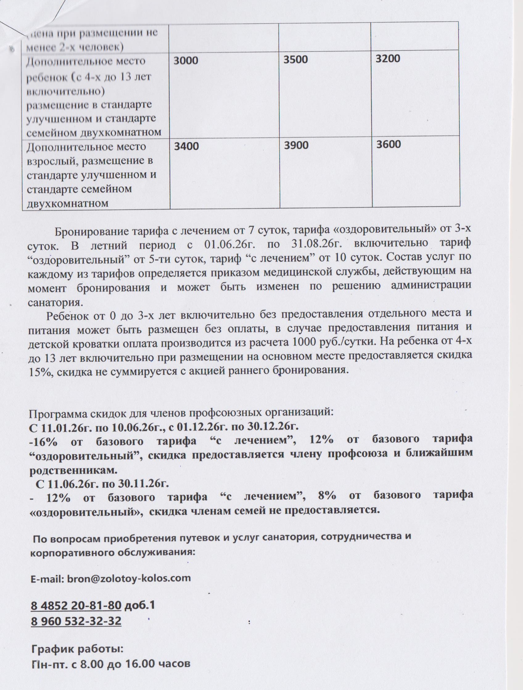 Представительство ООО «Санаторий Воробьево» в г. Калуга «Профсоюзная скидка» Профсоюзная скидка составляет – 20 % стоимости путевки. Путевки распределяются только через представительство и профсоюзные организации Калужской области. Санаторий зарекомендовал себя отличным лечением, питанием и проживанием. Стоимость путевок в ООО «Санаторий Воробьево» на период с 12.01.26. г. по 31.05.2026г.