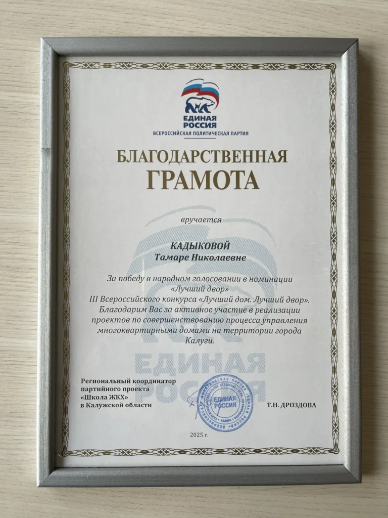 в ЦК «Единой России» Калужской области прошло заседание партийного проекта «Школа ЖКХ» Благодарственной грамотой отмечена Кадыкова Тамара Николаевна за победу в народом голосовании, в номинации «Лучший двор» III Всероссийского конкурса «Лучший дом. Лучший двор».
