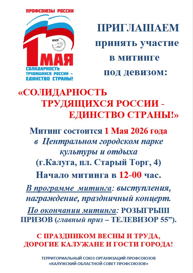 1 мая 2026 г. состоится митинг под девизом: “СОЛИДАРНОСТЬ ТРУДЯЩИХСЯ РОССИИ – ЕДИНСТВО СТРАНЫ!”