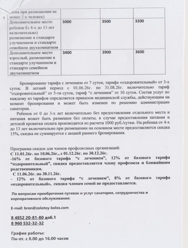 Представительство ООО «Санаторий Воробьево» в г. Калуга «Профсоюзная скидка». Профсоюзная скидка составляет – 20 % стоимости путевки. Путевки распределяются только через представительство и профсоюзные организации Калужской области. Санаторий зарекомендовал себя отличным лечением, питанием и проживанием. Стоимость путевок в ООО «Санаторий Воробьево» на период с 12.01.2026 г. по 31.05.2026 г.